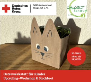 In unserer Osterwerkstatt basteln wir nachhaltige Osterdekorationen. Aus Tetrapack werden zum Beispiel bunte und individuelle Oster- und Kresse-Nester. So hauchen wir alten Materialien neues Leben ein und verwandeln sie in schöne, kreative Osterdekorationen. Ein Angebot für Kinder im Alter von 8-12 Jahren. Die Teilnahme ist kostenfrei. Anmeldungen per Mail an ausbildung@drk-rhein-erft.de oder telefonisch unter 02271606170. Das Angebot findet im Rahmen der Rotkreuz Umwelt und Nachhaltigkeitsbildung und in Zusammenarbeit mit dem Umwelt- und Naturparkzentrum Erftstadt statt.